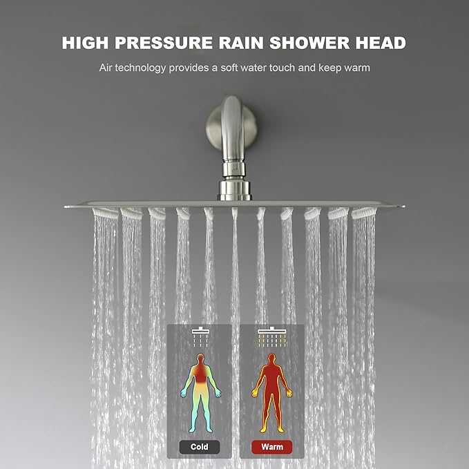 - Enjoy the Bath: the large 12 inch raining sprinkler with air mixing technology increase the water pressure to 100%, like walk into the natural raining. 6-Function hand held shower head switch freely from rinse, mist, spray, message, mixer. For all your and your family's showering needs.