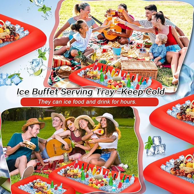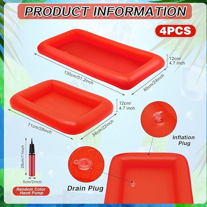 Leitee 4 Pcs Inflatable Ice Serving Bars Buffet Serving Tray Drink Cooler for Pool Party Inflatable Ice Tray Floating Food Drink Containers with Drain Plug and a Hand Pump, 2 Sizes (Red)