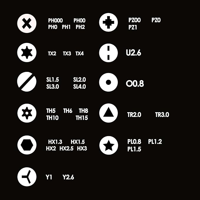 - 【SET INCLUDES】: 1PC Precision Alum Magnetic Holder. 34PC Precision S2 Bits: PH:000,00,0,1,2 / TX:2,3,4 / SL:1.5,2,3,4 / TH:5,6,8,10,15 / HX:1.3,1.5,2,2.5,3 / Y:Y1 ,Y2.6 PZ:000,0,1 / U:U2.6 / O:O0.8 / TR:2.0,3.0 / PL:0.8,1.2,1.5