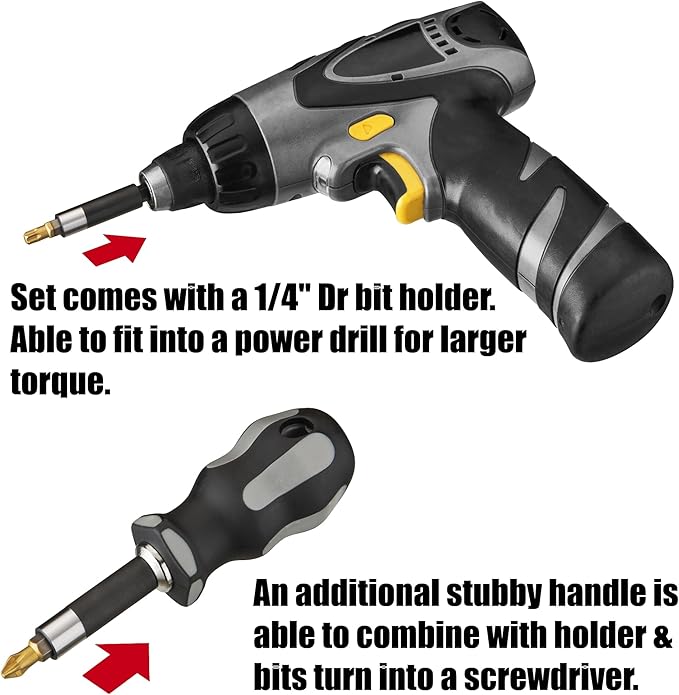 - 【SET INCLUDES】: 26PC 1/4" DR. BITS-> ACR PH:0,1,2,3 / SL:3,4,5,6 / HX:3,4,5,6 / TH:10,20,30,40 / TX:10,15,20,25,27,30,40 / PZ:1,2,3 1PC MEGNETIC BIT HOLDER-> A 2.36" bits adapter in order to connect to power tools. 1PC STUBBY HANDLE-> Provide 1PC stubby handle to conncet with bits adapter turn into a stubby screwdriver usage