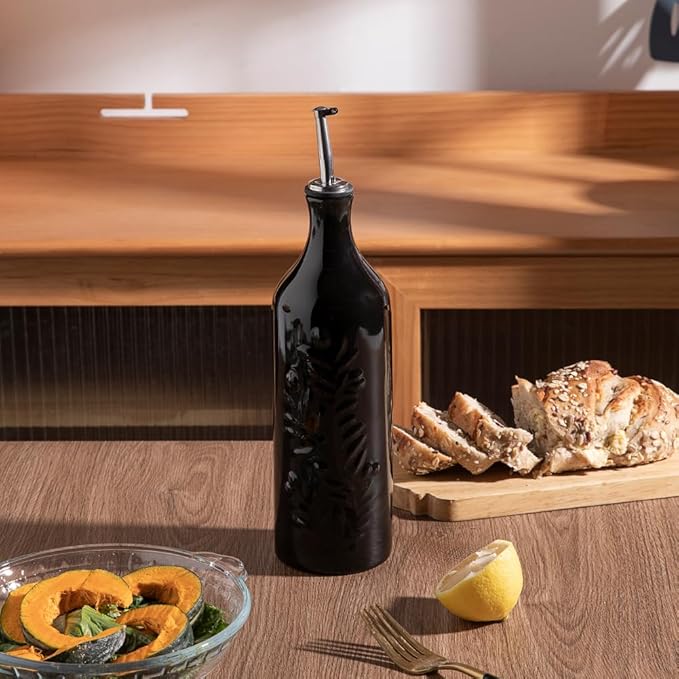 Sweejar Large Olive Oil Dispenser Bottle with Spout, 24 Oz Ceramic Oil Dispenser for Kitchen, Relief Opaque Oil Cruet, Oil Container for Cooking, EVOO, Avocado Oil, Vinegar, Pack of 1(Black)