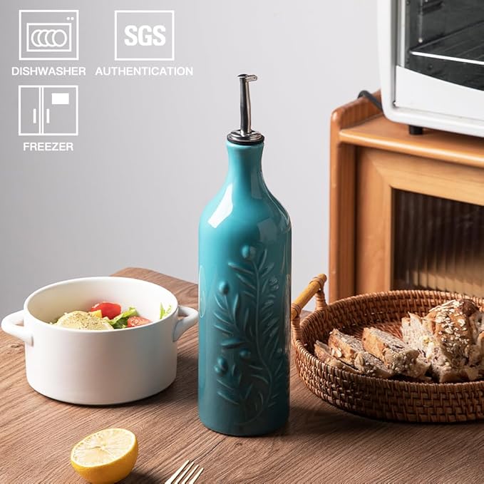 - Durable and Precise Pouring Control - The olive oil bottle fired at high temperatures, to form a smooth glazed surface, strength and durability. The carefully designed spout that allows for easy pouring without any messy drips or spills.