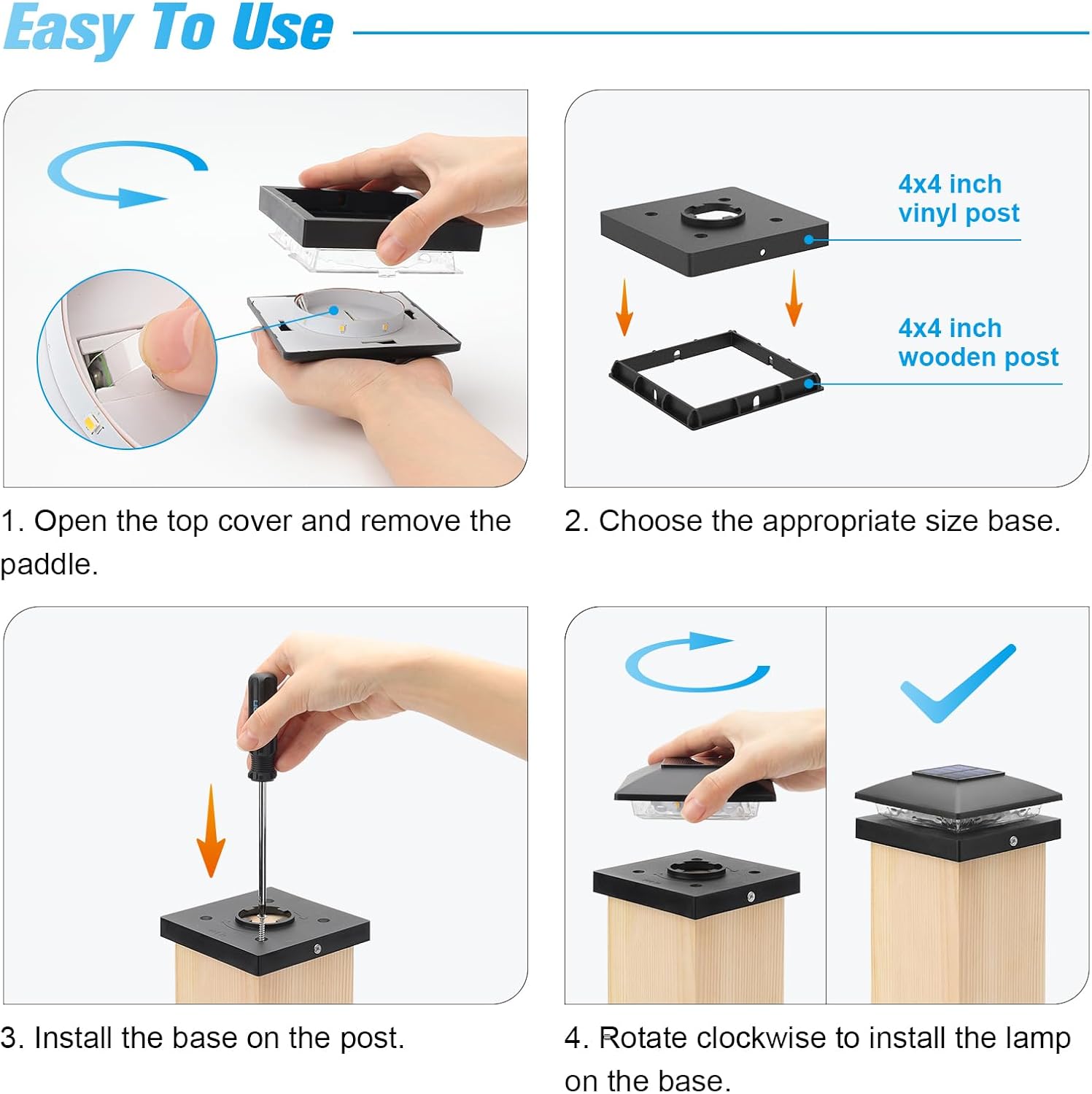 - 【Easy Installation】Each package contains 2 bases (4x4 wooden post and 4x4 vinyl post) and 12 screws. Choose the appropriate base size and place it on the corresponding post, then screw the two screws into the post through the small holes on both sides of the base. The solar fence post cap light is charged in sunlight for 6-8 hours during the day and automatically turns on for 10-12 hours at night