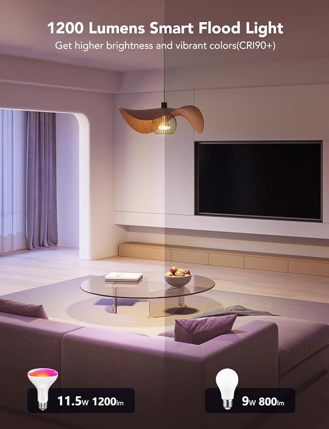 - Higher Brightness: Producing much brighter light vs common standard 60W LED bulbs, these 1200 lumens BR30 smart bulbs are ideal for large areas. Get higher brightness (85W equivalent) and vibrant colors (CRI90+) while saving on your energy bill.