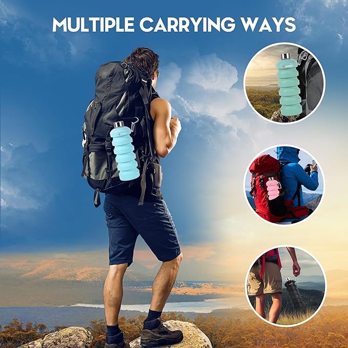 JaneJu Collapsible Water Bottle, 32oz BPA Free Silicone Reusable Portable Lightweight Foldable Water Bottles with Carabiner, Leak Proof Sports Water Bottle with Stainless Twist Cap (Black)