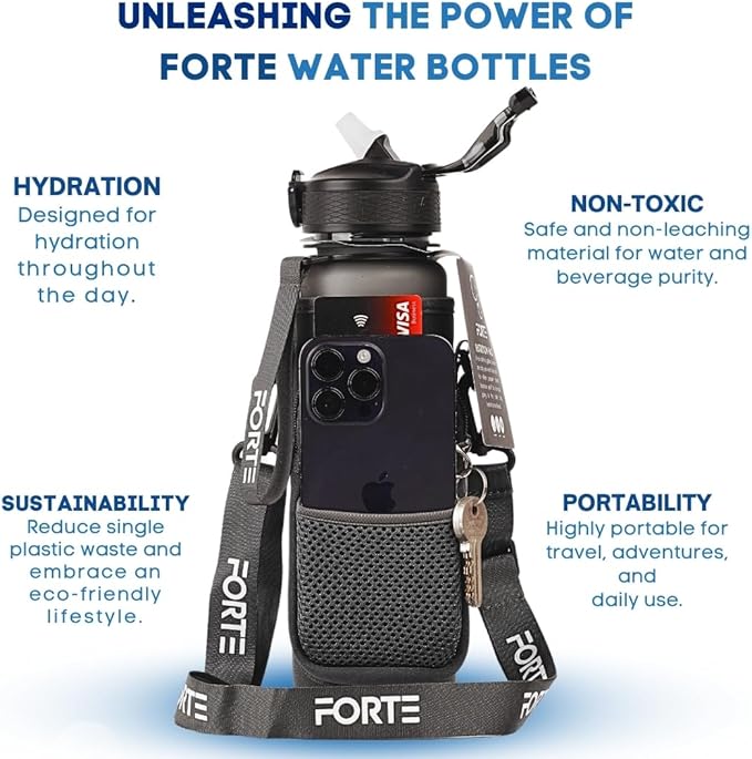 FORTE Plastic Water Bottle with Sleeve - BPA-Free Water Jug with Leak Proof Lid and Straw - Perfect for Gym, Office, and Everyday Use (Grey)