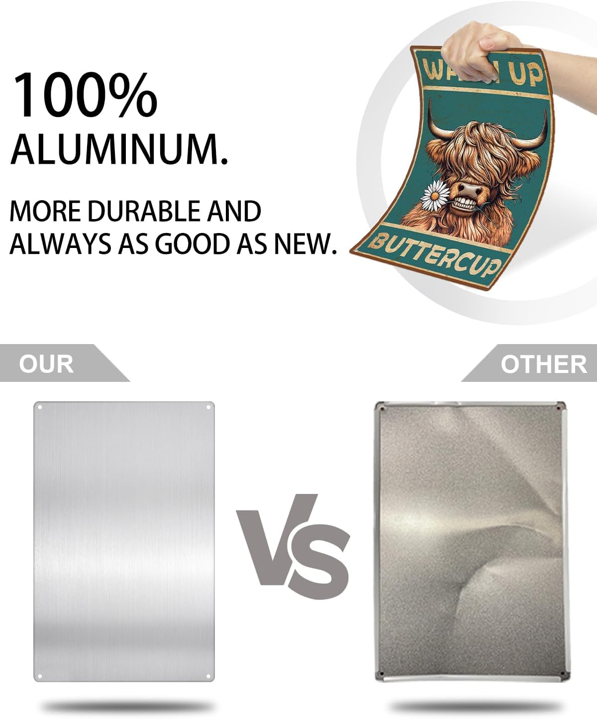 - Constructed from 100% rust-free aluminum: With four pre-drilled holes in the rounded corners, it's easy to hang on walls or other surfaces, allowing for versatile indoor and outdoor display