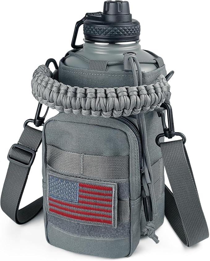 - Tactical Sports Bottle with Holder ◊ The lid with handle, the paracord handle on the water bottle sleeve, and the detachable shoulder strap provide you with a variety of carrying options and travel convenience. The front pocket can hold your cell phone, keys, and other essentials. The Mollo system offers more possibilities to carry more things with you.