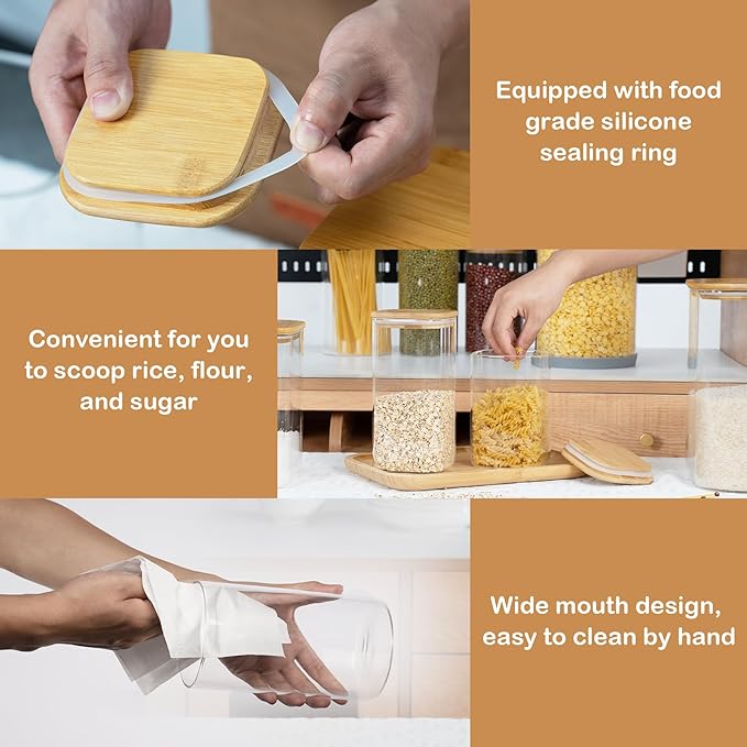 - [Transparent jar]- Transparent square glass containers make your items visible, allowing you to clearly see the contents of the glass storage jar and the remaining stock, and then you can easily replenish the food that is about to run out.