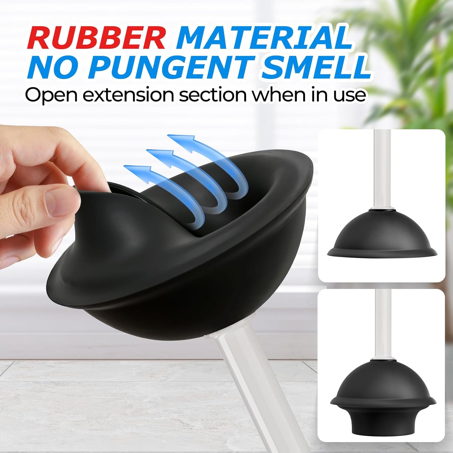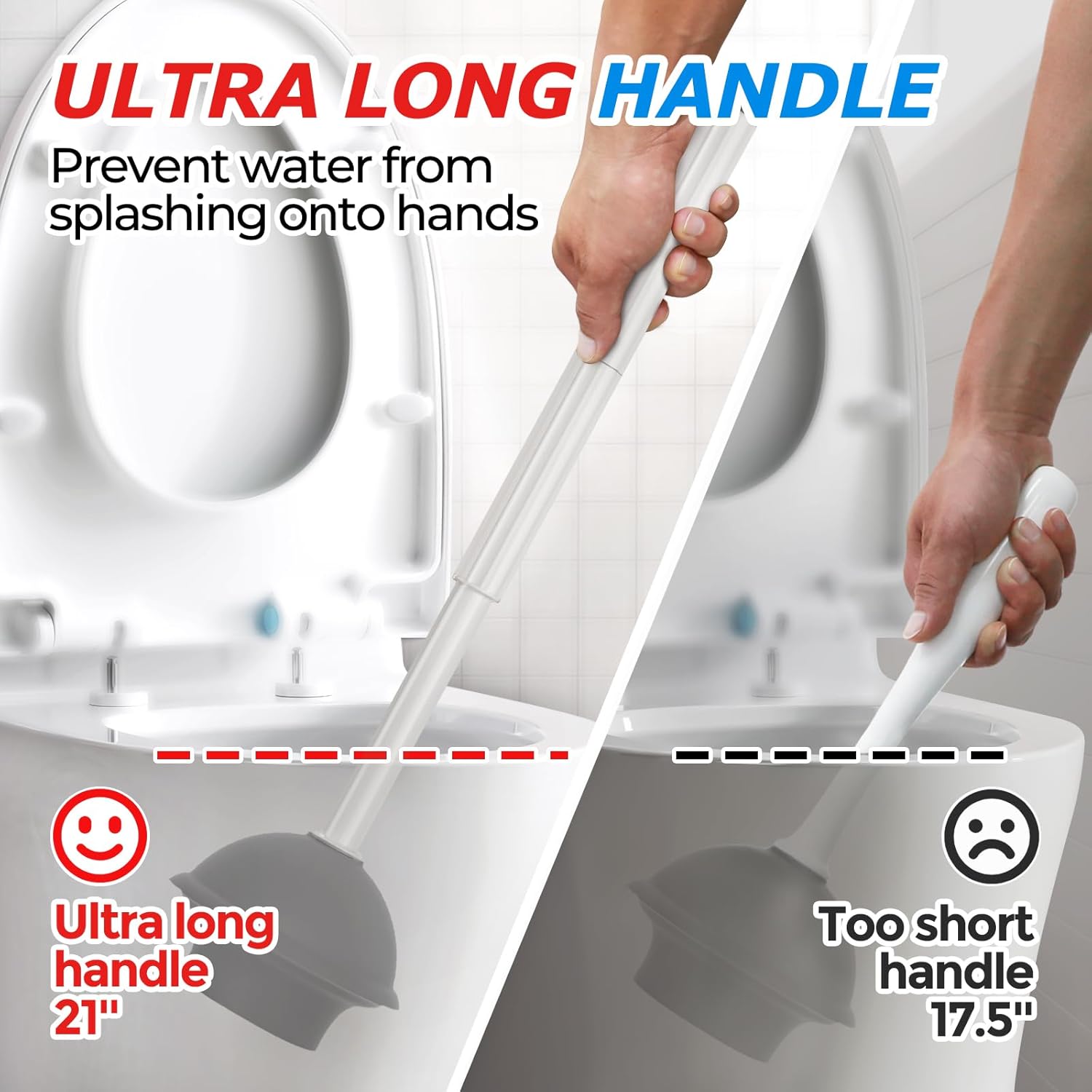 - Extended handle -Heavy Duty Toilet Plunger: Compared to ordinary handles, our upgraded extended handle provides a better user experience and prevents stains from splashing onto the hands.A professional powerful suction cup that can solve various blockage problems. Comfortable handles provide greater support during use.
