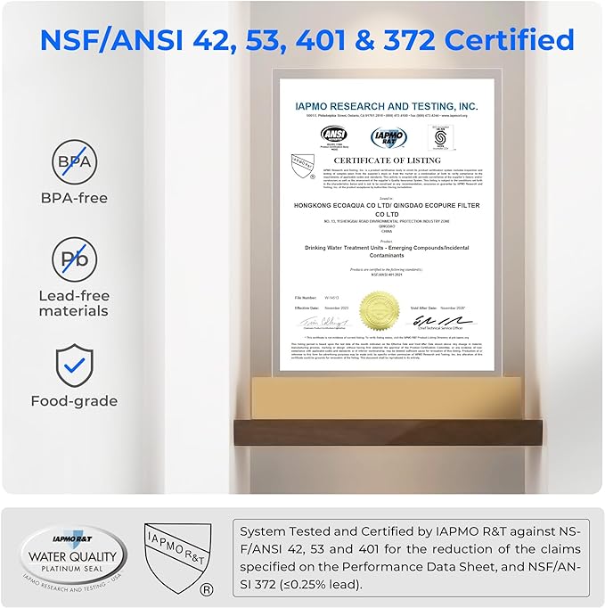 - [NSF/ANSI 42, 53, 401 & 372 Certified] The filtered water pitcher has been certified by IAPMO against NSF/ANSI 42, 53, 401 & 372 standards to reduce 30+ substances including chlorine, lead, mercury, benzene, bisphenol A and more. It also has been tested by a third-party lab to reduce PFOA, PFOS, ensuring high-quality drinking water.⚡This system DOES NOT lower TDS value. If you prefer low TDS value, please choose Waterdrop RO system.⚡