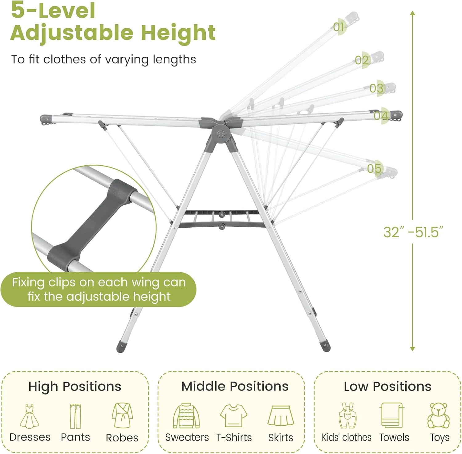 Giantex Clothes Drying Rack, 2-Layer Aluminum Foldable Laundry Drying Rack with 5-Level Adjustable Height, 21 Drying Rails, 10 Side Clips, 4 Shoe Holders, Space Saving Collapsible Laundry Drying Rack