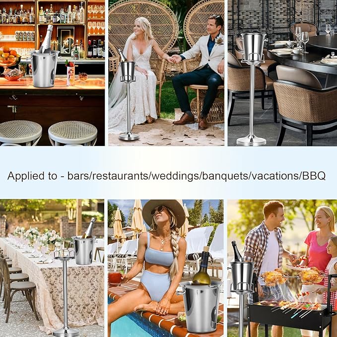 - 【Detachable bracket】A champagne ice bucket with a stand will not occupy the space on the desktop. Of course, you can remove the red wine cooler from the ice bucket stand. This standing ice bucket is not only suitable for indoor use, but can also be moved to outdoor use
