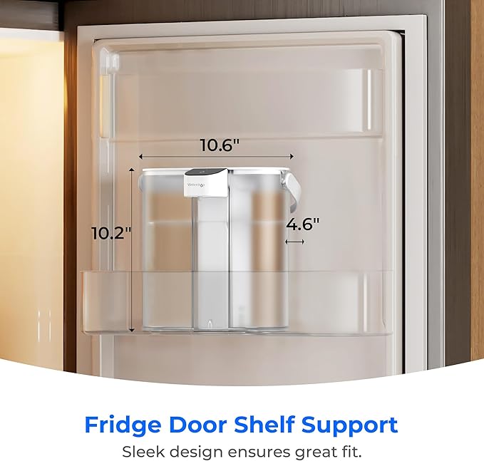 - [Fridge Door Shelf Support] Specifically crafted to accommodate your fridge, this electric water filter is designed to effortlessly rest on the door shelf. It takes up minimal space, ensuring that your fridge remains uncluttered while providing more room for your food and other items.