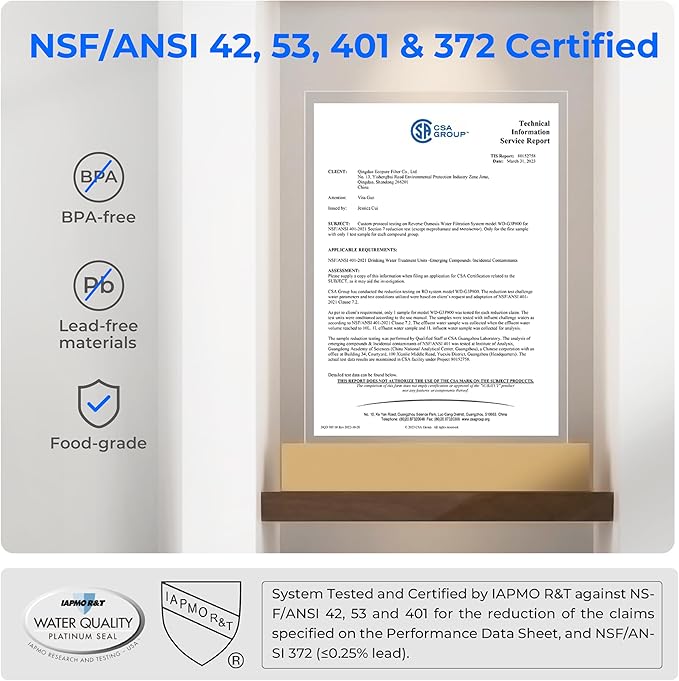 - [NSF/ANSI 42, 53, 401 & 372 Certified] The Compact electric water filter pitcher has been certified by IAPMO against NSF/ANSI 42, 53, 401 & 372 standards to reduce 30+ substances including chlorine, lead, mercury, benzene, bisphenol A and more. The electric water filter has been tested by a third-party lab to reduce PFOA, PFOS, ensuring high-quality drinking water.