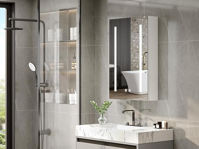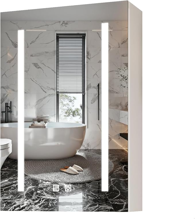 - 【LED Medicine Cabinet】The bathroom medicine cabinet is equipped with three color LED lights: warm light, neutral light, and cool light, to meet different lighting or makeup needs. The brightness of the lights can be freely adjusted through sensitive touch button, with a short press to adjust the light color and a long press to adjust the brightness. Additionally, the cabinet features brightness and color temperature memory function, allowing users to conveniently recall their preferred settings.
