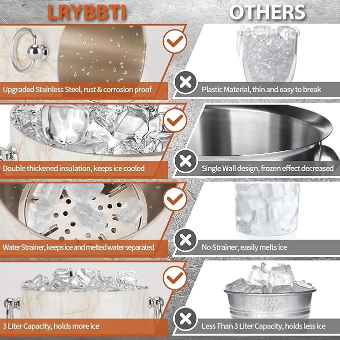 - KEEPS FROZEN LONGER - LRYBBTI 3.0 Qt ice bucket is made of double wall strong stainless steel for quality insulation. It is more efficient to keep your ice frozen. Comes with an airtight lid for frozen temperature locked up to 6 hours.
