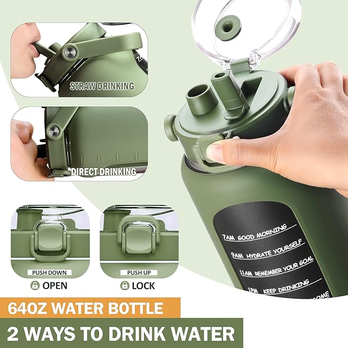 BLUEGO 64oz Insulated Water Bottle with Straw and Handle Leakproof Half Gallon Wide Mouth Motivational Water Bottle, 2-IN-1 Straw Spout Lid Stainless Steel Water Jug for Sport Travel Gym-Oliver