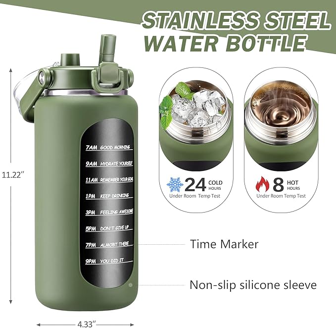 - 【PREMIUM QUALITY】 Crafted from 100% BPA-free, food-grade stainless steel, our half-gallon insulated water bottle features double-wall vacuum insulation. It keep-cold for 24 hrs and keep-warm for 8 hrs. Inside with extra straw and sponge brush for cleaning. Outside with silicone sleeve for non-slip.