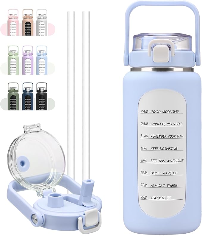 BLUEGO 64oz Insulated Water Bottle with Straw and Handle Leakproof Half Gallon Wide Mouth Motivational Water Bottle, 2-IN-1 Straw Spout Lid Stainless Steel Water Jug for Sport Travel Gym-Light Blue