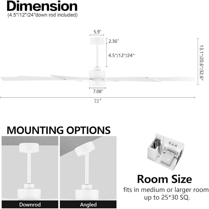 - Easy to Install: The 72" blade span makes this DC ceiling fan perfect for spaces like living rooms, bedrooms, kitchen, office or warehouse, adaptible for ceilings tilting within 15°. 3 Down rods (4.5"/12"/24"long) are included to match different ceiling heights