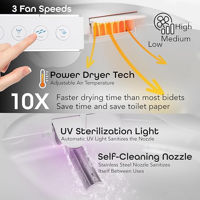 BidetMate 3500 Series Electric Bidet with Dryer, Heated Smart Toilet Seat with Automatic Opening and Closing Lid & Seat, Unlimited Heated Water, Remote, Warm Air Dryer, and Self-Cleaning - Elongated