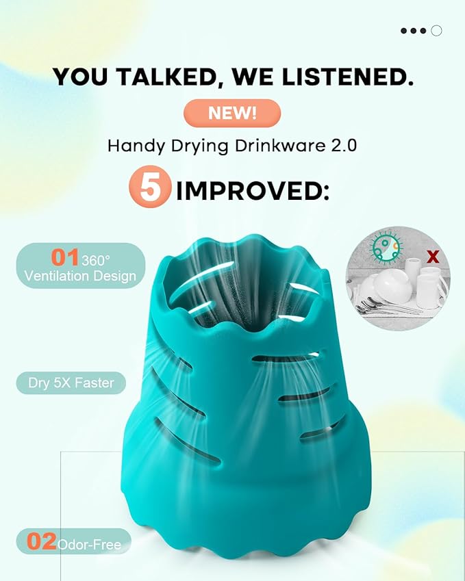 - Individual Faster Water Bottle Drying Rack - Our water bottle drying rack features a 360° full-body perforated ventilation design for quickly drying drinking bottles, glassware, and ceramic mugs of various shapes and sizes. By keeping them vertical and off the counter, it enhances drying efficiency. The vibrant color also adds a fun touch to an otherwise mundane task