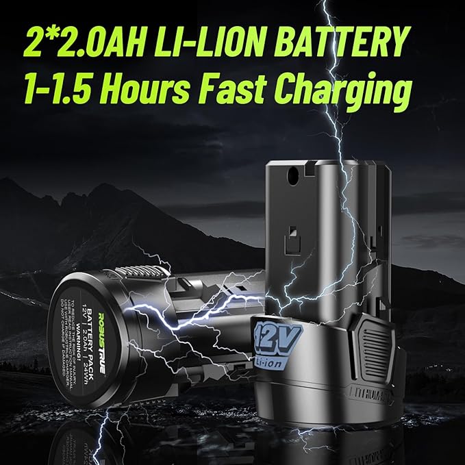 - 2x 2000 MAH Battery and Long Lasting: Robustrue's battery passes rigorous 1000 charge cycle tests to ensure its durability and longevity. The power ratchet wrench is equipped with two rechargeable 12 V batteries, which can be used continuously for 4 hours after being fully charged. The powerful battery life speeds up your work efficiency