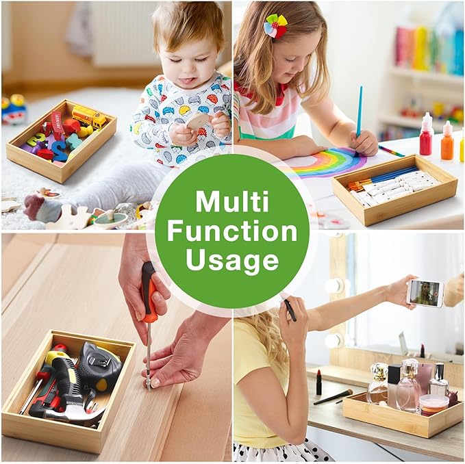 - Comprehensive Package: the package comes with 8 bamboo storage box, providing more storage options for different drawer sizes and items; Whether you need to declutter a large kitchen drawer, small bathroom drawer, or a medium sized desk drawer, these bamboo organizers have got you covered; Enjoy seamless organization and upscale your drawer aesthetic with these versatile and chic organizers