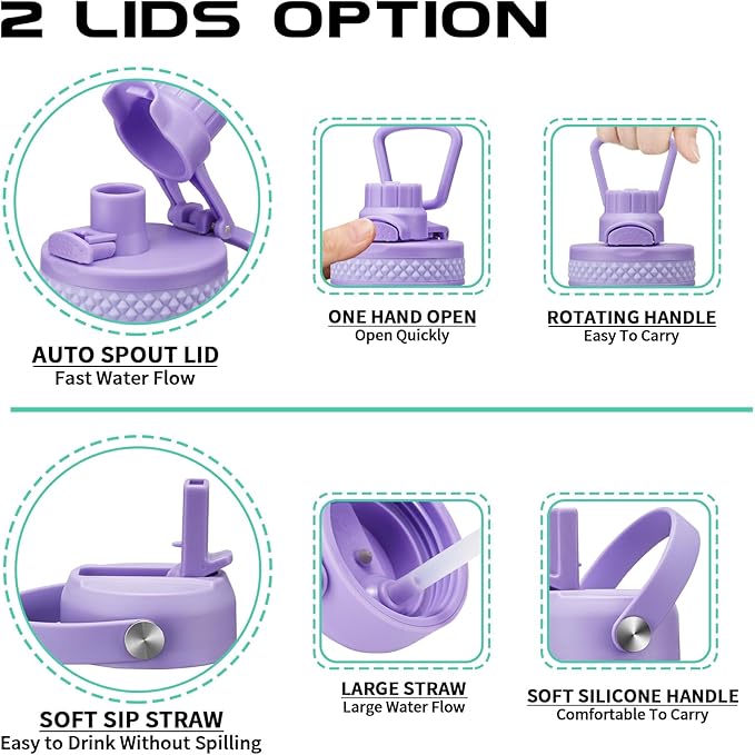 - 2 LEAKPROOF LIDS OPTIONS: The auto spout cap & straw lid provide your different drinking experience. The ONE-HAND operation pop-up spout lid for easy enjoy your fast water flow. The SPILL-PROOF straw lid with high flow rate & BPA free. Both 2 lids design with a sturdy handle, making the Hydrogen flask water bottle more convenient to carry