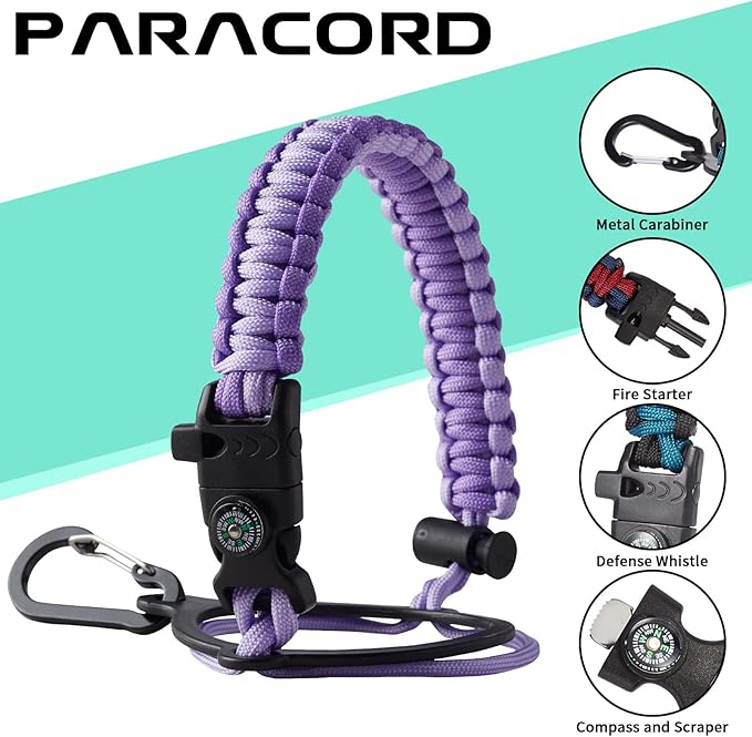 - UNIQUE PARACORD HANDLE: Bright color paracord matches the flask water bottle to give you a youthful vibe while adding a personal style. With a compass, safety loop, metal carabiner, flint, igniter and whistle to become your survival tool, making the 32 oz metal water bottle with paracord an ideal survival kit for expeditions in the wild