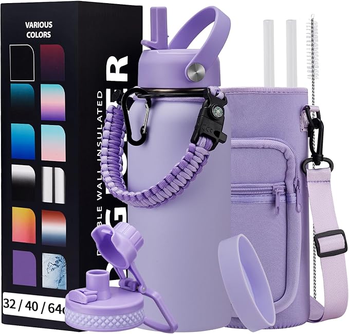 - SUPER JOYFUL COMBO: Buy 32 oz water bottle and get 9 accessories (2 x lids, 1 x survival paracord, 1 x carrying pouch, 1 x shoulder strap, 1 x protective cup mat, 2 x straws, 1 x straw brush). WITH A LIFETIME GUARANTEE, these thermal water bottles are perfect gifts for using at home, work, school, road trips, hiking, sporting events, or just hanging out