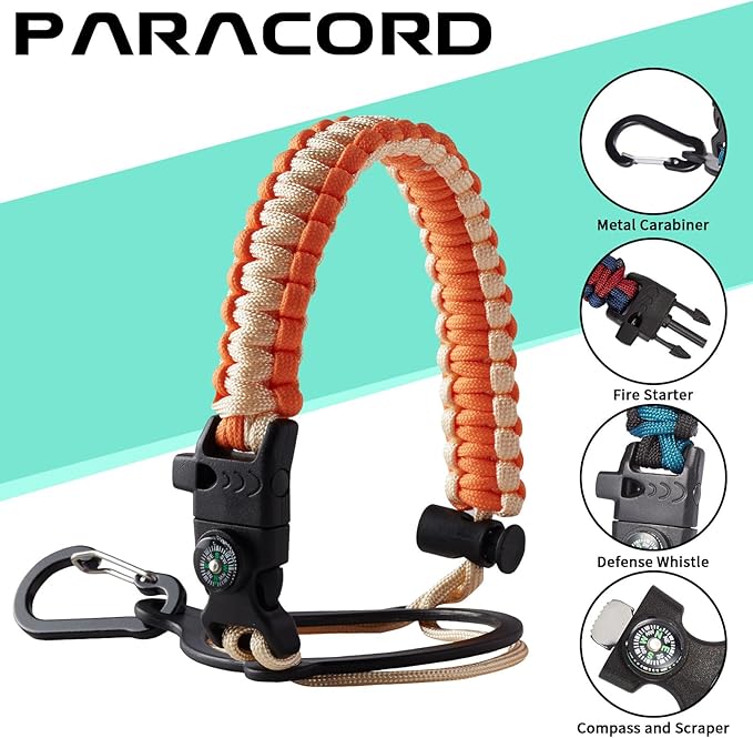- UNIQUE PARACORD—Perfect Accessories: bright color paracord matches the flask water bottles to give you a youthful vibe while adding a personal style. It comes with a compass, safety loop, metal carabiner, flint, igniter, and whistle to become your survival tool for your wild adventures