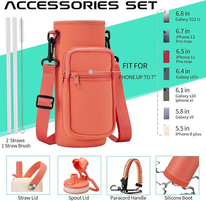 - COMBO—Super Deal: Buy 40 oz water bottles and get 9 accessories (2 x lids, 1 x survival paracord, 1 x carrying pouch, 1 x shoulder strap, 1 x protective cup mat, 2 x straws, 1 x straw brush). WITH A LIFETIME GUARANTEE, these metal water bottles are the perfect gift for use at home, work, school, road trips, hiking, sporting events, or just hanging out