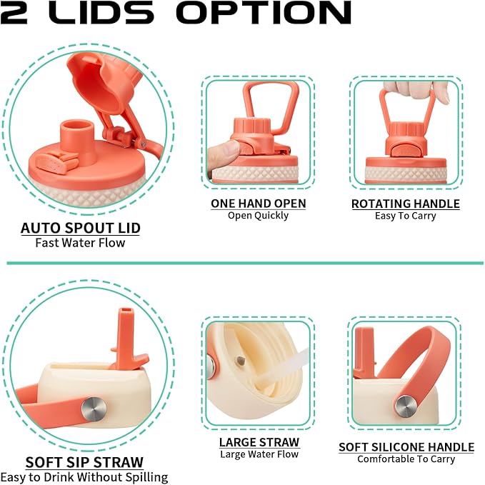 - 2 LIDS—100% Leak Proof: the auto spout cap & straw lid provide your different drinking experience. The ONE-HAND operation pop-up spout lid for convenient enjoy your fast water flow. The SPILL-PROOF straw lid with high flow rate & BPA free. Both 2 lids design with a sturdy handle, making the thermal water bottle more convenient to carry