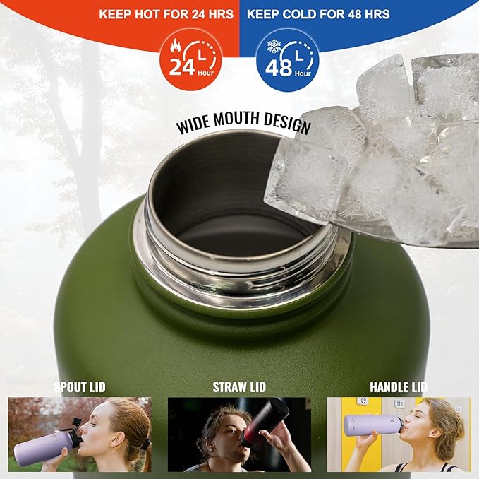 - 【DOUBLE-WALL VACUUM INSULATION】- We insulated water bottles adopt double-layer insulation wall design and vacuum sealing. This means you can enjoy your favorite hot and cold drinks for a long time, no matter what season you're in. It can keep hot drinks hot for 24 hours and cold drinks cold for 48 hours! Advanced technology prevents heat transfer to outer wall, protects your hands from the temperature of beverage.