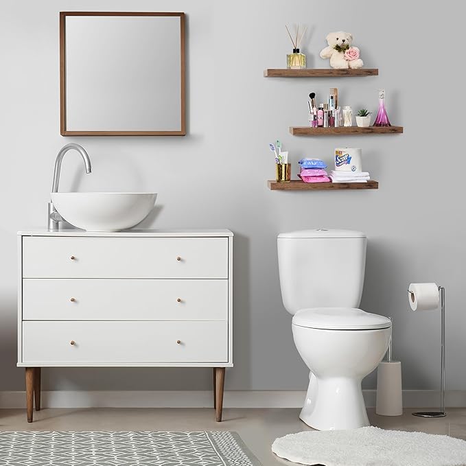 - Versatile & Functional Floating Wall Shelves: Install these floating shelves in the bedroom or bathroom to hold beauty/hair products - Place your wall shelf under a mirror in the entryway or exhibit family photos gallery style in a long hallway - Use as bathroom shelf, book shelf for wall, wall decor for bedroom, over the toilet shelf, kitchen floating shelves, floating nightstand, kitchen decor, living room wall decor, display shelf, and more
