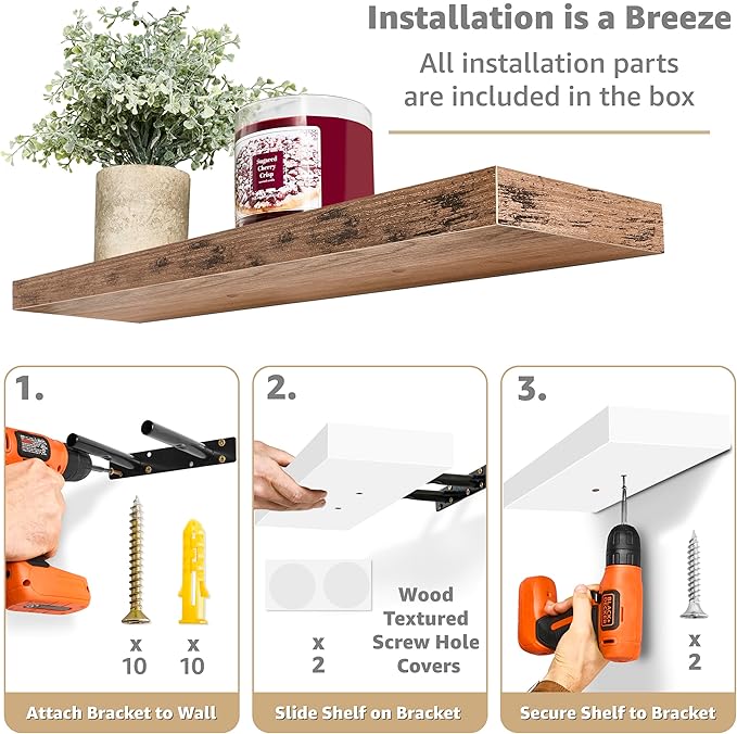 - Easy to Install: Minor assembly required, detailed instructions included - Sorbus Wall Floating Shelves are made of beautiful engineered faux wood (not solid wood) - Feature a smooth matte finish - Enhanced steel brackets attach firmly to the wall without visible support - Sturdy enough to hold up to 22 lbs - Mounting Hardware INCLUDED - Color may be slightly different from the pictures depending on lighting and/or screen settings