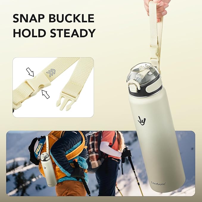 Enerbone Insulated Water Bottle, 32 oz Stainless Steel Water Bottles with Carrying Strap, Double-Wall Vacuum Insulation Thermos, Leakproof Sports Bottle with Straw, Keep Drinks Hot or Cold for Hours