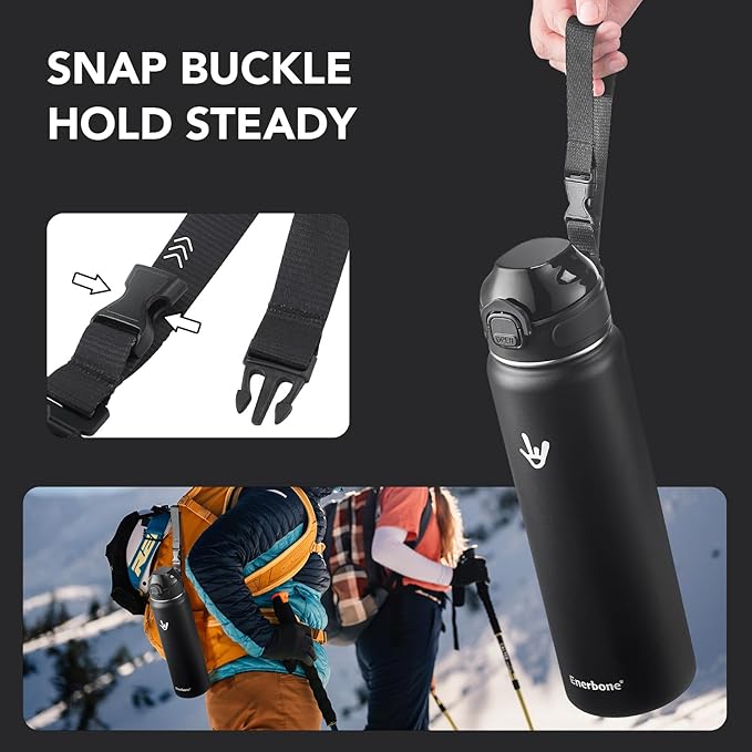 Enerbone Insulated Water Bottle, 32 oz Stainless Steel Water Bottles with Carrying Strap, Double-Wall Vacuum Insulation Thermos, Leakproof Sports Bottle with Straw, Keep Drinks Hot or Cold for Hours