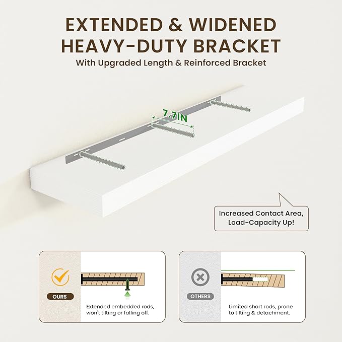 - EASY TO INSTALL - Come with all the installation hardware you need. We have a smart installation design. Thicken metal brackets help boards to be stable and load-bearing, vertical to the wall, and not sagging. The shelves have pre-drilled holes in the bottom to allow screws to secure the boards to the brackets to prevent them from slipping