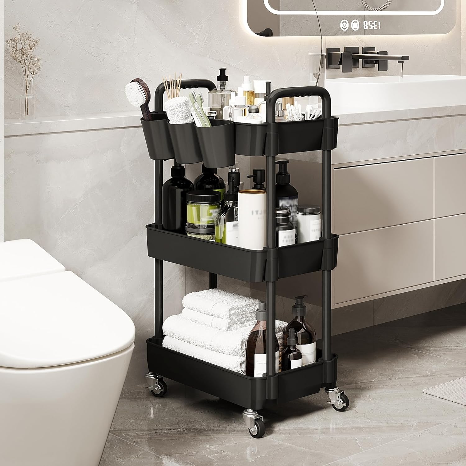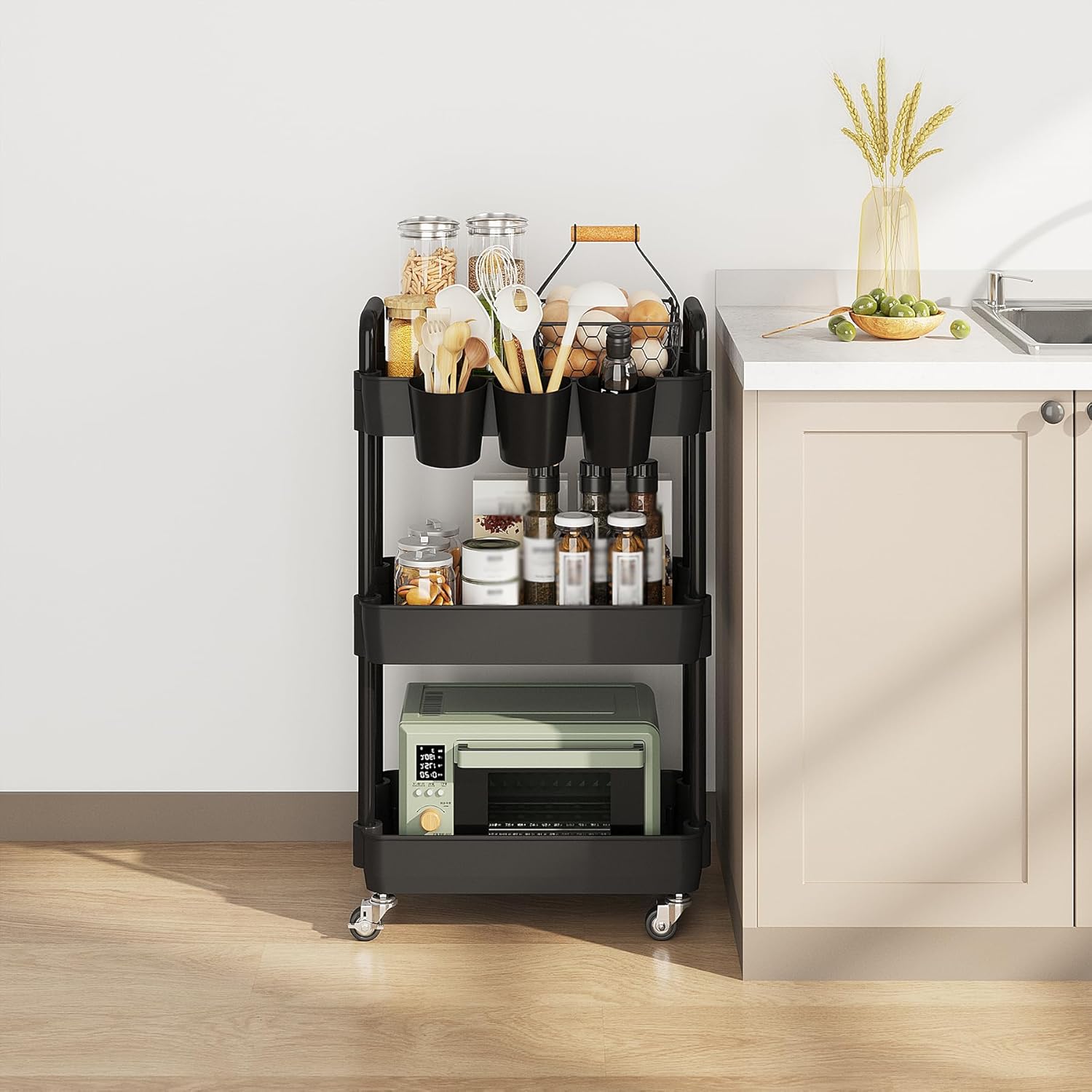 UDEAR 3-Tier Rolling Utility Cart,Multifunctional Storage Shelves with Handle and Lockable Wheels for Room,Office,Kitchen,Bathroom,with 3 Hanging Cups,Black