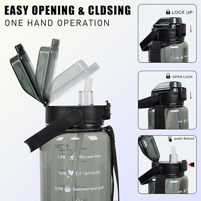 - [Large Gallon Water Jug]: Made from safe, BPA-free materials, this 64 oz water bottle with a straw and measurements marked makes sure you drink healthily with every sip. It holds 8 cups of water - the daily recommendation by health experts - meaning less frequent refilling.