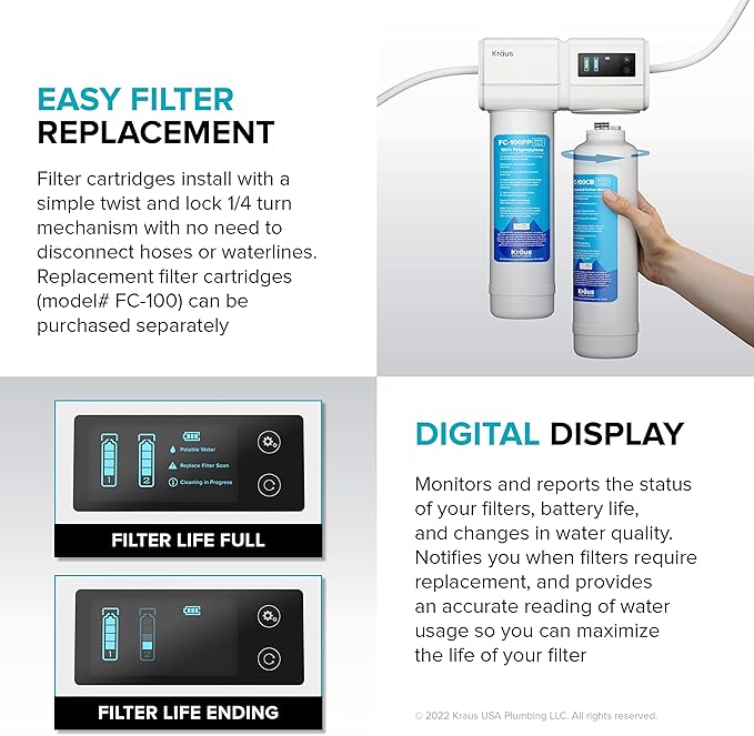 - UNDER-SINK DESIGN installs directly below your sink – INSTALLATION-READY with all mounting hardware, tubing, and batteries for fast and easy DIY set up – QUICK-CONNECT ADAPTERS make it easy to connect the filter system to your water supply lines