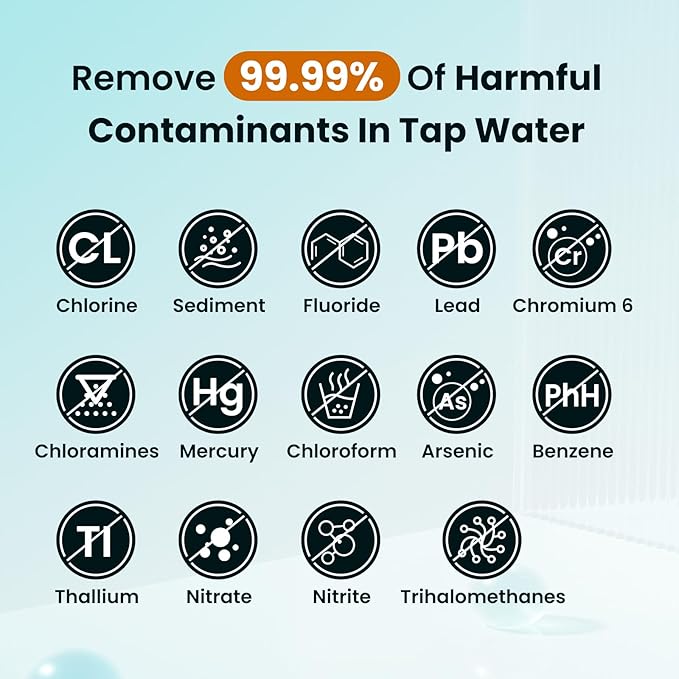 - Superior Purification - Eliminates 99.99% of contaminants commonly found in tap water, including Chlorine, Sediment, PFOA/PFOS, Lead, Chromium 6, Chloramines, Mercury, Chloroform, Trihalomethanes, Arsenic, Benzene, Thallium, Nitrate, and Nitrite. Ensures that your water is free from impurities, safeguarding the hapiness of you and your family. Exceptional filtration performance for pure drinking water!