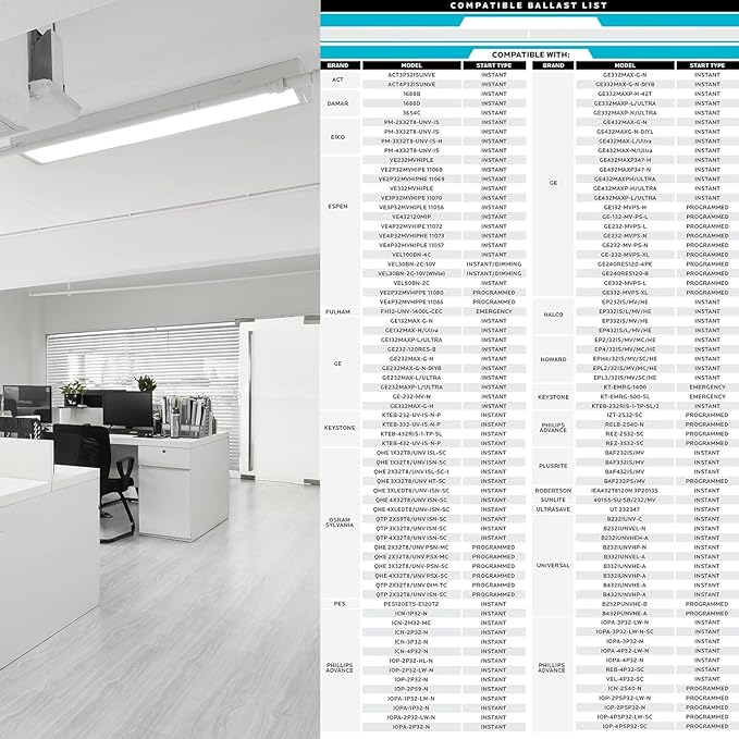 - PLUG & PLAY - Use these as a direct replacement to your existing fluorescent tube lights that make use of the ballast already in your ceiling fixture. These 48inch LED bulbs are compatible with an extensive list of ballasts so you can just install these without making any adjustments. No need to change your shunted lamp holders or tombstones. CHECK THE BALLAST LIST FOR COMPATIBILITY.
