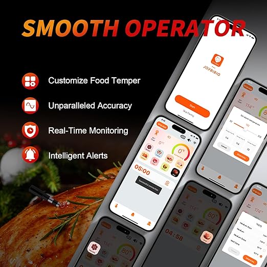 - 【Instantly Alerts Reminder】You can view the cooking thermometer on the host display screen without using a smart APP. You can also monitor cooking time, set desired temperature, and receive alerts through the JOYBIBIQ APP on your phone.