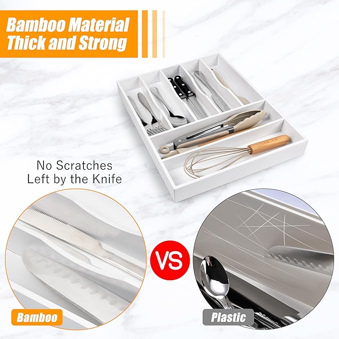 - ✅【Perfect premium bamboo】Our utensil silverware drawer organizer flatware cutlery tray is crafted from natural bamboo that has been grown for over 4 years. Each silverware drawer organizer made of bamboo is meticulously handcrafted by seasoned artisans to ensure a smooth, splinter-free surface. You can confidently allow your family or children to use our silverware drawer organizer. Unlike plastic and metal drawer organizers, our utensil holder is water-resistant and odor-resistant, making it perfect for long-term use.