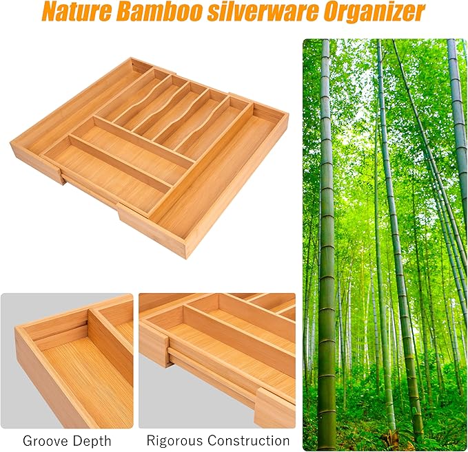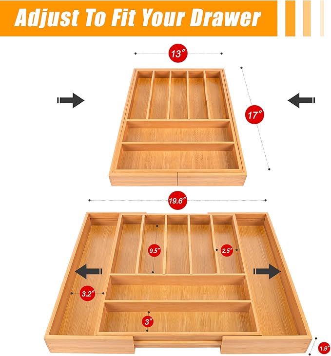- ✅【Expandable - fit most kitchen drawers.】Our large utensil silverware drawer organizer flatware cutlery tray are adjustable in width, expanding from 17"x13" to 17"x19.6" as needed, with a depth of 1.9" . The utensil silverware drawer organizer is crafted from natural bamboo that has been grown for over 4 years. Each silverware drawer organizer made of bamboo is meticulously handcrafted by seasoned artisans to ensure a smooth, smooth surface. You can confidently allow your family or children to use our silverware drawer organizer.