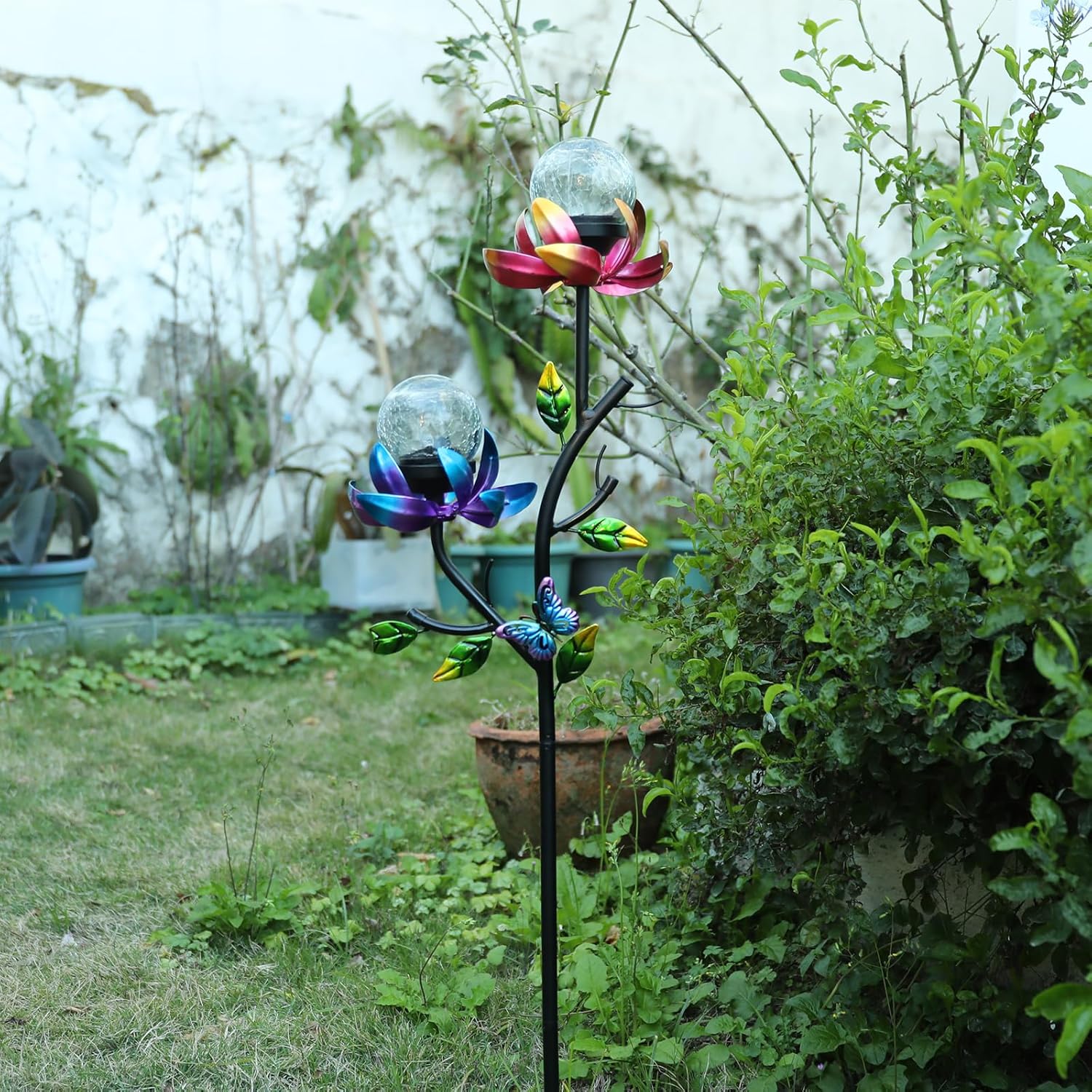 VCUTEKA Solar Garden Light Solar Flowers Light with LED Crackle Glass Globe Solar Lights Outdoor Metal Garden Stake Wind Spinner for Garden Decoration, Patio Decor, Yard Decor and Gift for Mother